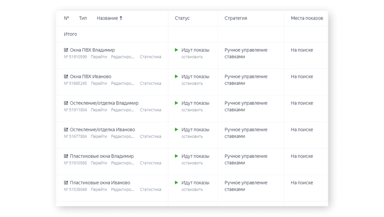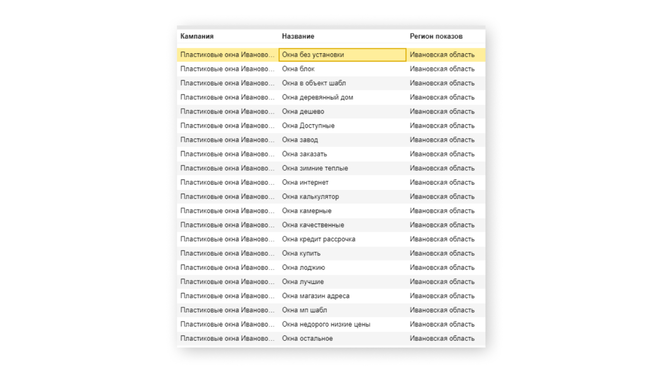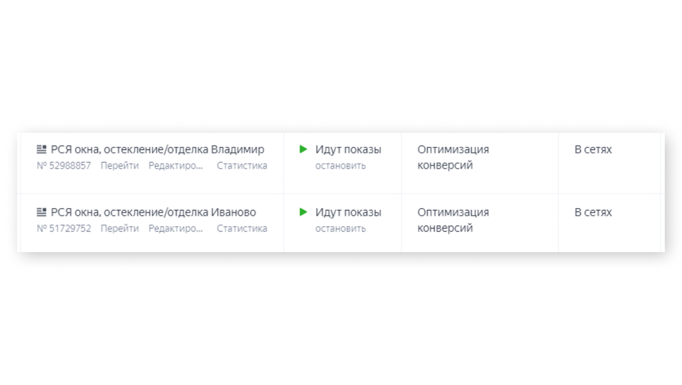 После запуска РК в Яндекс.Директе для Ивановской области постепенно дублировали кампании для Владимирской, Ярославской и Костромской области.