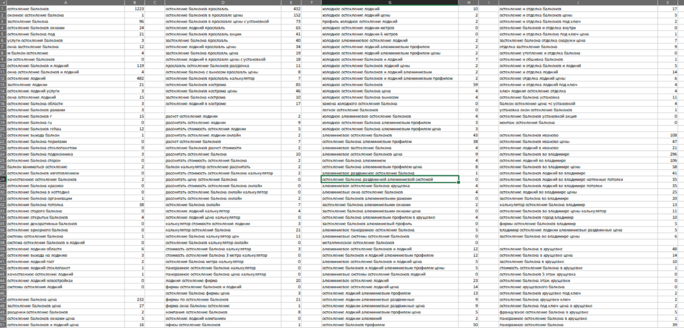 Собрали семантическое ядро из популярных/высокочастотных, среднечастотных и низкочастотных запросов. Ключевые слова собирали и в сезон и в несезон, т.к. не хотелось упускать потенциально значимые слова из-за нехватки для них статистики.