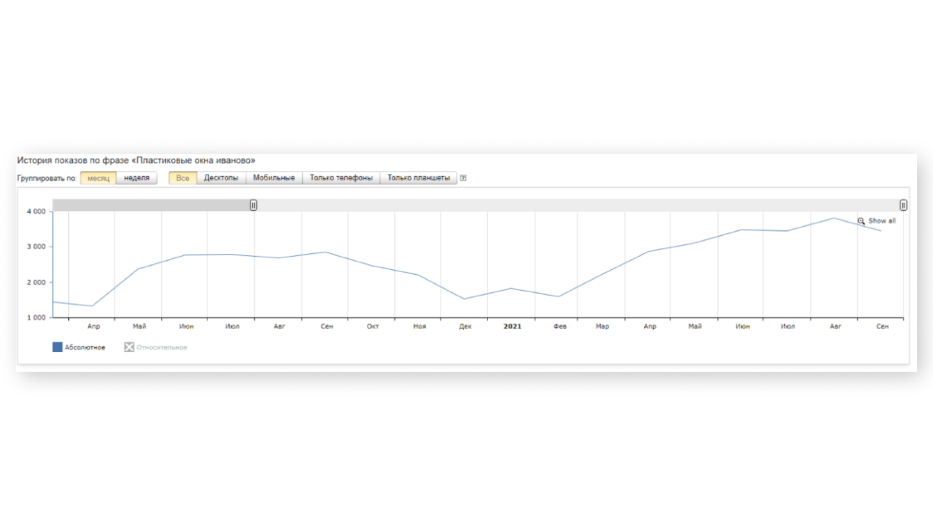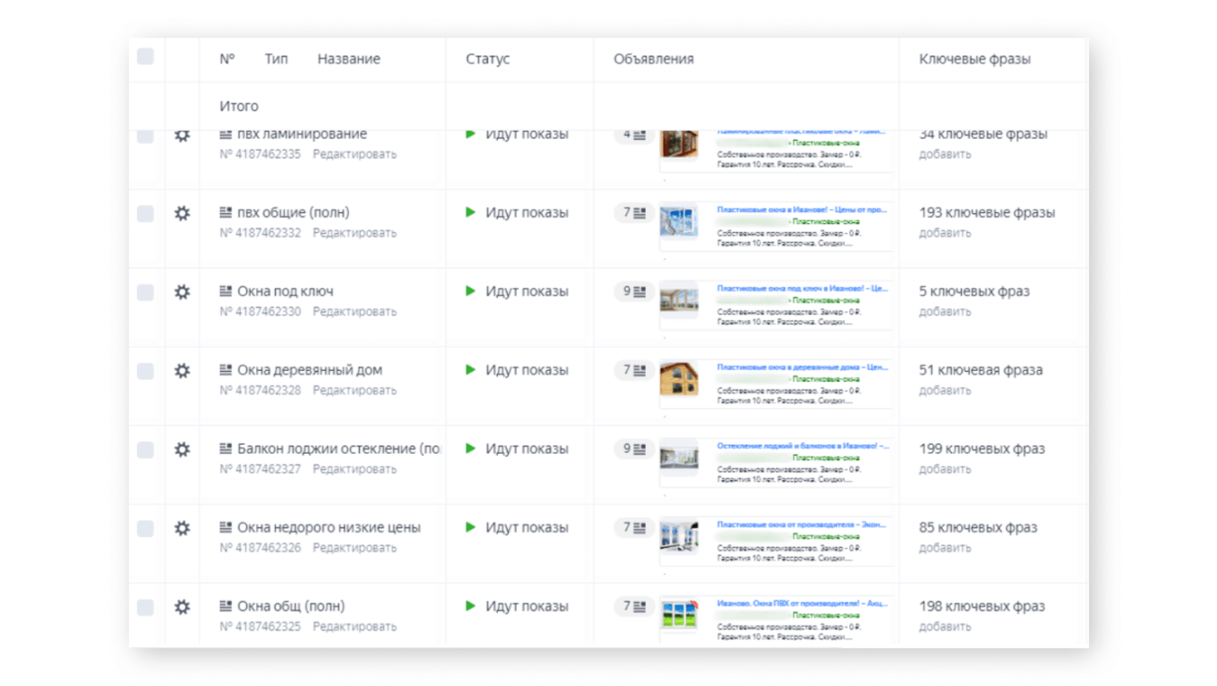 Мы решили запустить рекламу по всем услугам, а далее по накопленной статистике отсекать неэффективные настройки и в сезон оставить только приоритетные направления. В качестве приоритета выделили: установку окон, остекление и ремонт балконов, остекление коттеджей.