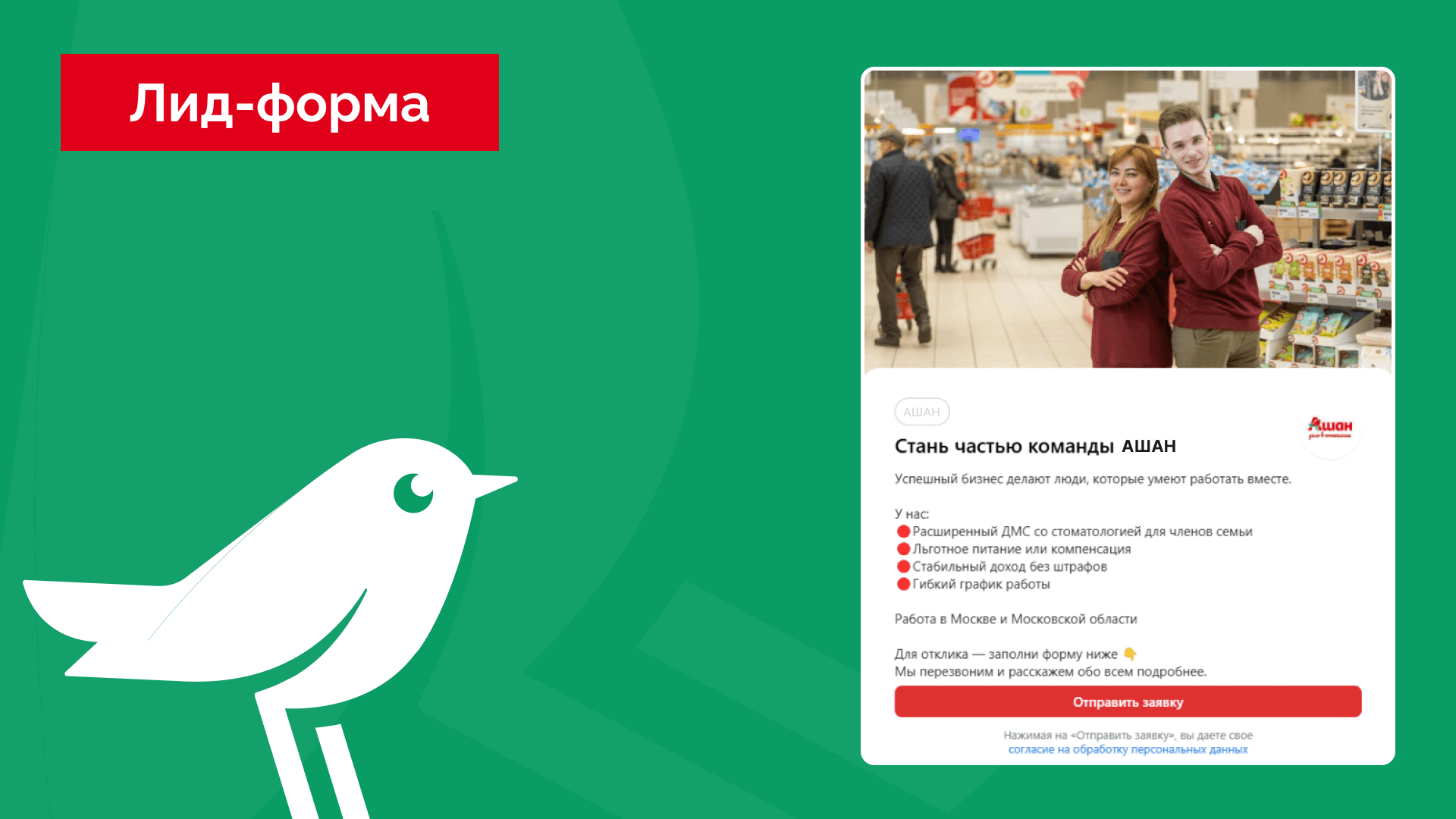 Во ВКонтакте использовали лид-формы без указания конкретных вакансий. Такой подход позволял расширить воронку кандидатов, а рекрутеры уже при обработке откликов могли предложить подходящие позиции.