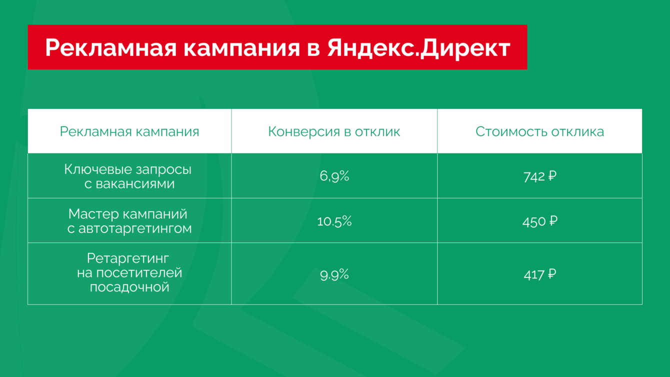 2) Рекламная кампания в РСЯ и на Поиске по ключам с вакансиями.