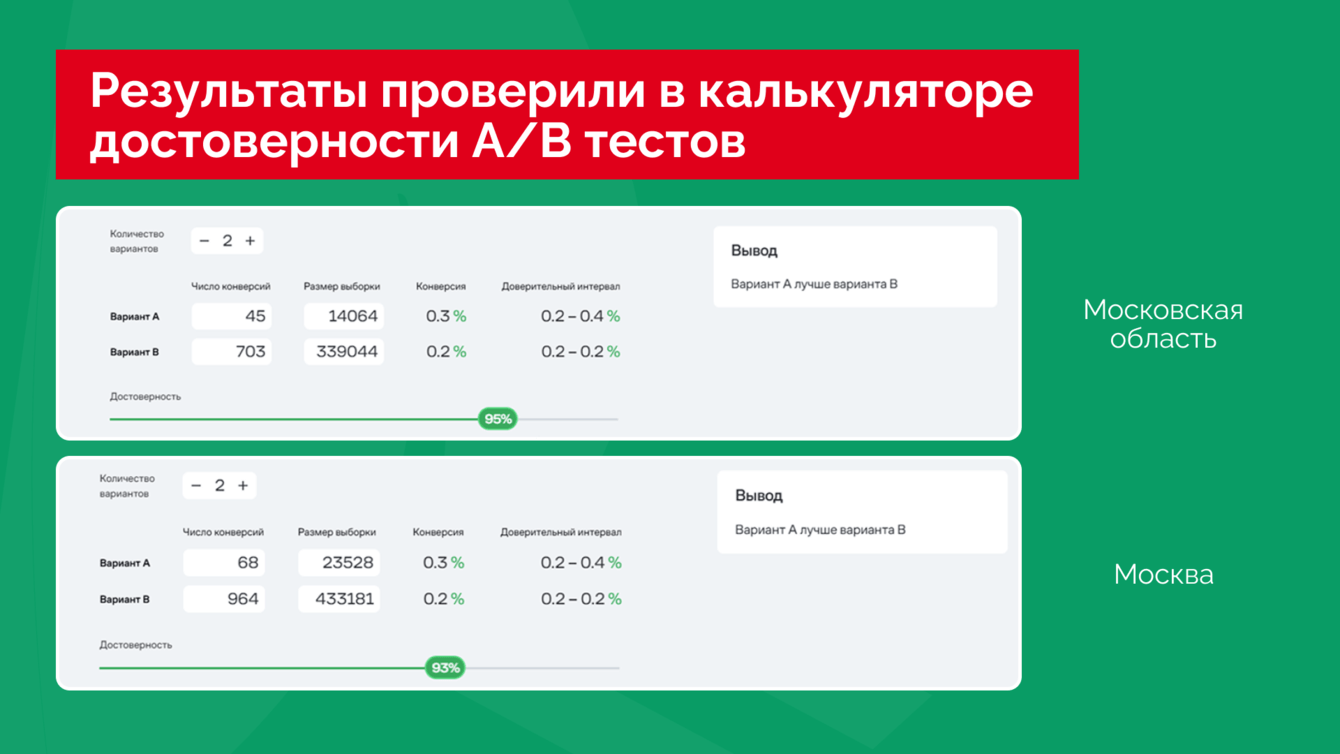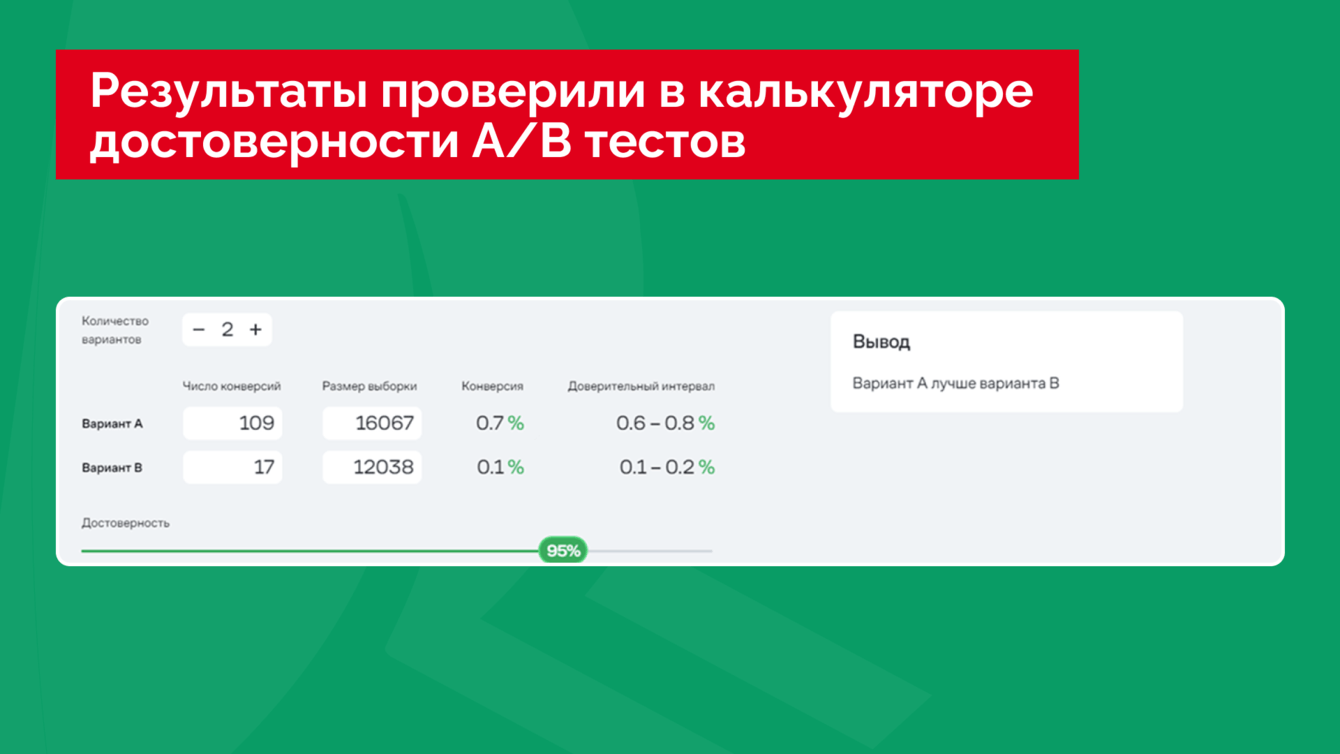 Кликабельность объявления сравнивали с другими и проверяли результаты в калькуляторе достоверности A/B-тестов.