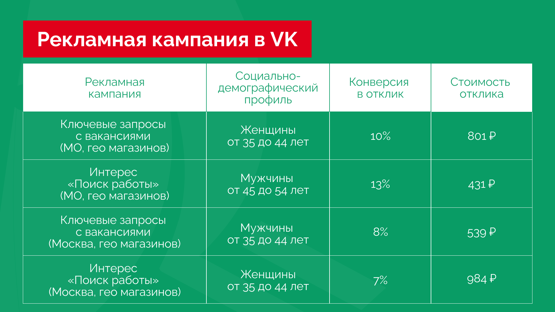 Главным вызовом для нас оказалась оптимизация VK Рекламы, где CTR был ниже планируемого. При работе с другим проектом нам удавалось удерживать кликабельность на уровне 0,6%, а здесь она составила 0,2%, независимо от креатива и аудитории, которой мы показывали рекламу. Мы связали это с особенностями региона, где конкуренция за кадры особенно высока.