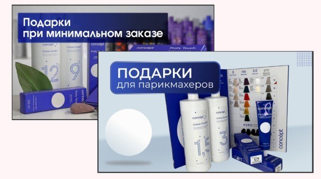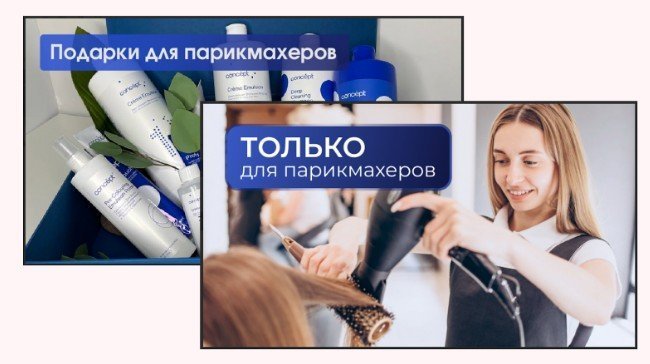 По опыту знаем, что люди чаще оставляют заявку, когда могут получить что-то взамен или протестировать продукт. Обсудили с клиентом этот момент. Оказалось, у бренда есть мерч, которым он охотно делится со своими клиентами. Сказано — сделано: Concept Hair предложили в качестве подарка стартовый пак парикмахера: фартук, кисти, миска для смешивания краски, при минимальном заказе на сайте. Отразили это в креативах: «Подарки при минимальном заказе», «Подарки для парикмахеров».