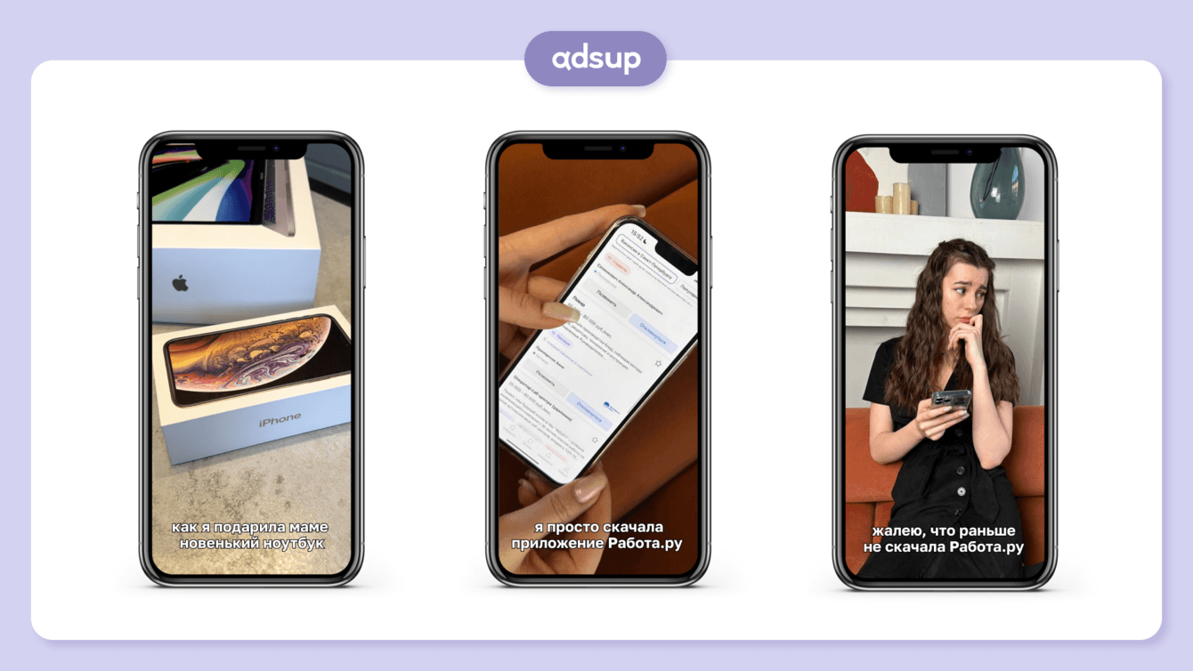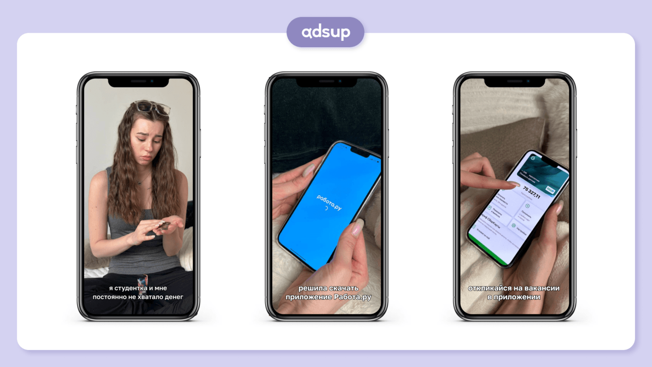 Это что касается статичных креативов, но мы снимали и UGC-контент, в котором модели поднимали актуальный питч: «Сегодня не обязательно быть в IT, чтобы найти удаленную работу».