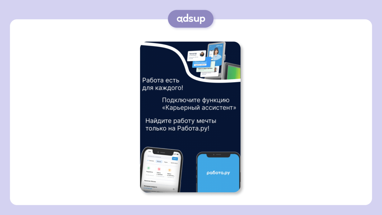 Россияне в возрасте 30-35 лет испытывают наименьшие трудности при поиске работы, а вот соискателям 54-56 лет это дается сложнее. Поэтому в наших креативах мы делали акцент на важность этого возрастного сегмента, используя фразы типа «работа для всех», «гибкий график» и «ваш опыт ценится».