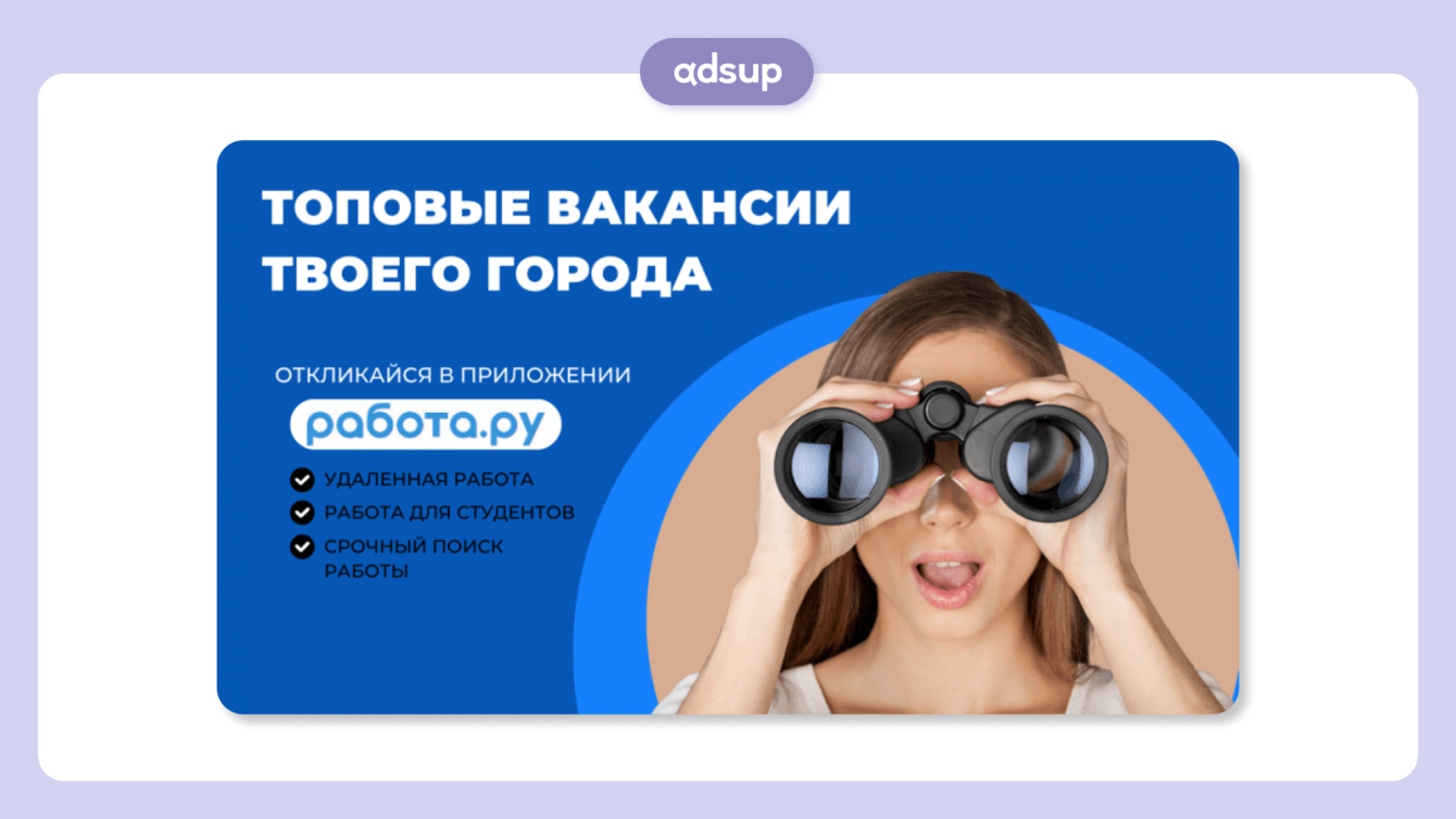 для каждой группы. Например, запуск креативов под запросы на вакансии отдельных гео и указание реальных зарплат.