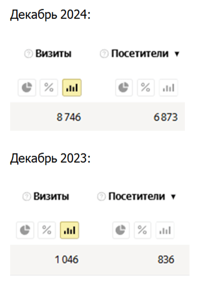 Показатели визитов (без роботов) в декабре 2024 выше на 736% по сравнению с декабрем 2023 года.