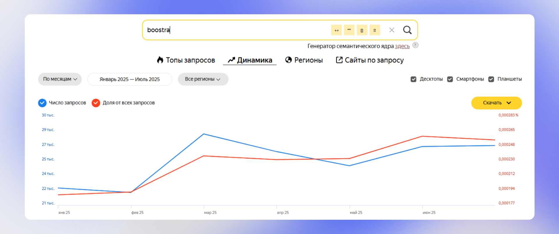 В этом кейсе мы расскажем, как с помощью комплексной стратегии, объёдинившей SEO, контекстную рекламу, таргетинг, SMM и другие каналы, мы не только диверсифицировали каналы привлечения, но и заложили фундамент для превращения boostra в узнаваемый бренд № 1, снизив долю CPA в общем потоке лидов. Вы узнаете о ключевых гипотезах, тактических решениях и измеримых результатах, которые привели к росту органического трафика на 3248%, снижению стоимости брендового лида на 40%.
