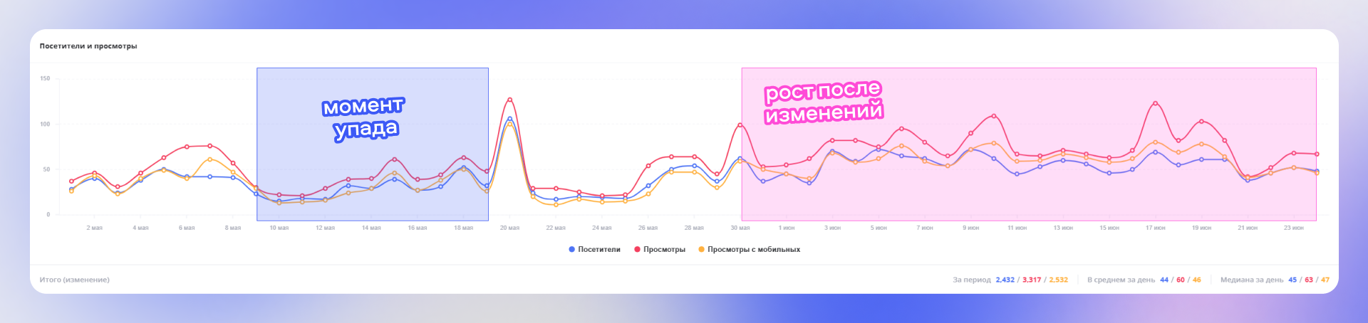 В результате после проседания активности и охватов выросли в 2 раза по просмотрам и визитам.