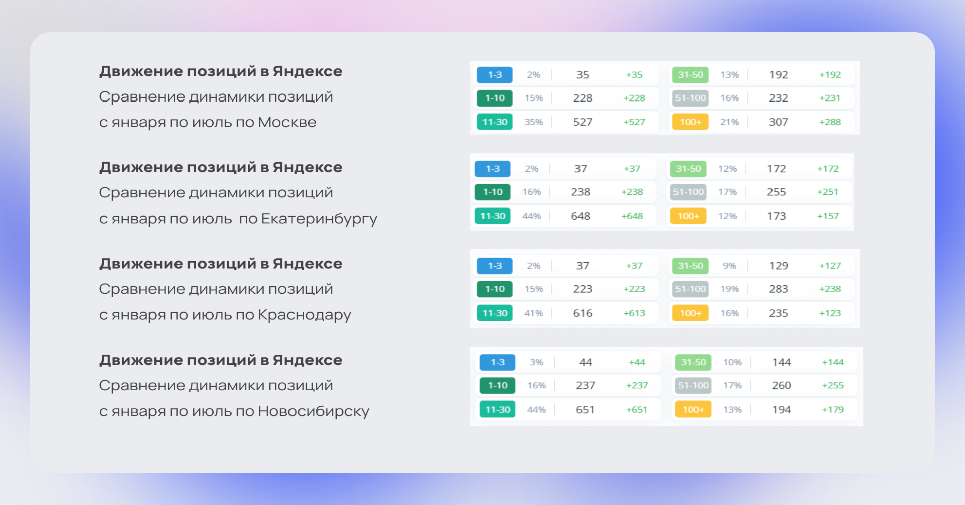 SEO-стратегия показала улучшения позиций на 90.6% — с 100 позиции в январе до 9.43 позиции в июле 2025 года. Это означает переход от полного отсутствия в поисковой выдаче к стабильному присутствию в топ-10 по целевым запросам.