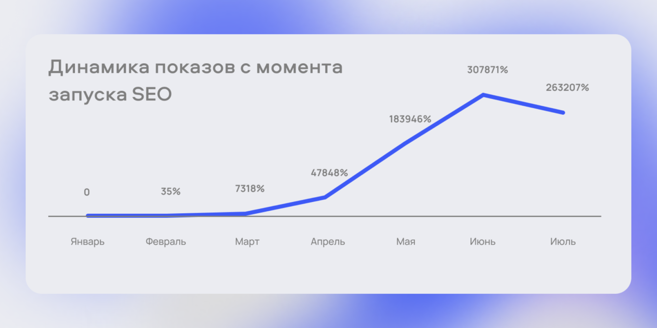 Январь: 0 показов (стартовая точка) → Июнь: +307871% прирост показов (пиковое значение)