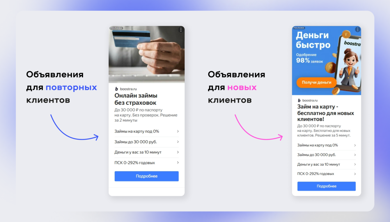 Также мы тестировали ещё несколько рекламных кампаний, но они были успешны выборочно: кто-то давал результат, но мало, или приводил только постоянных клиентов. Помимо прямых запросов по типу: «Взять заём».