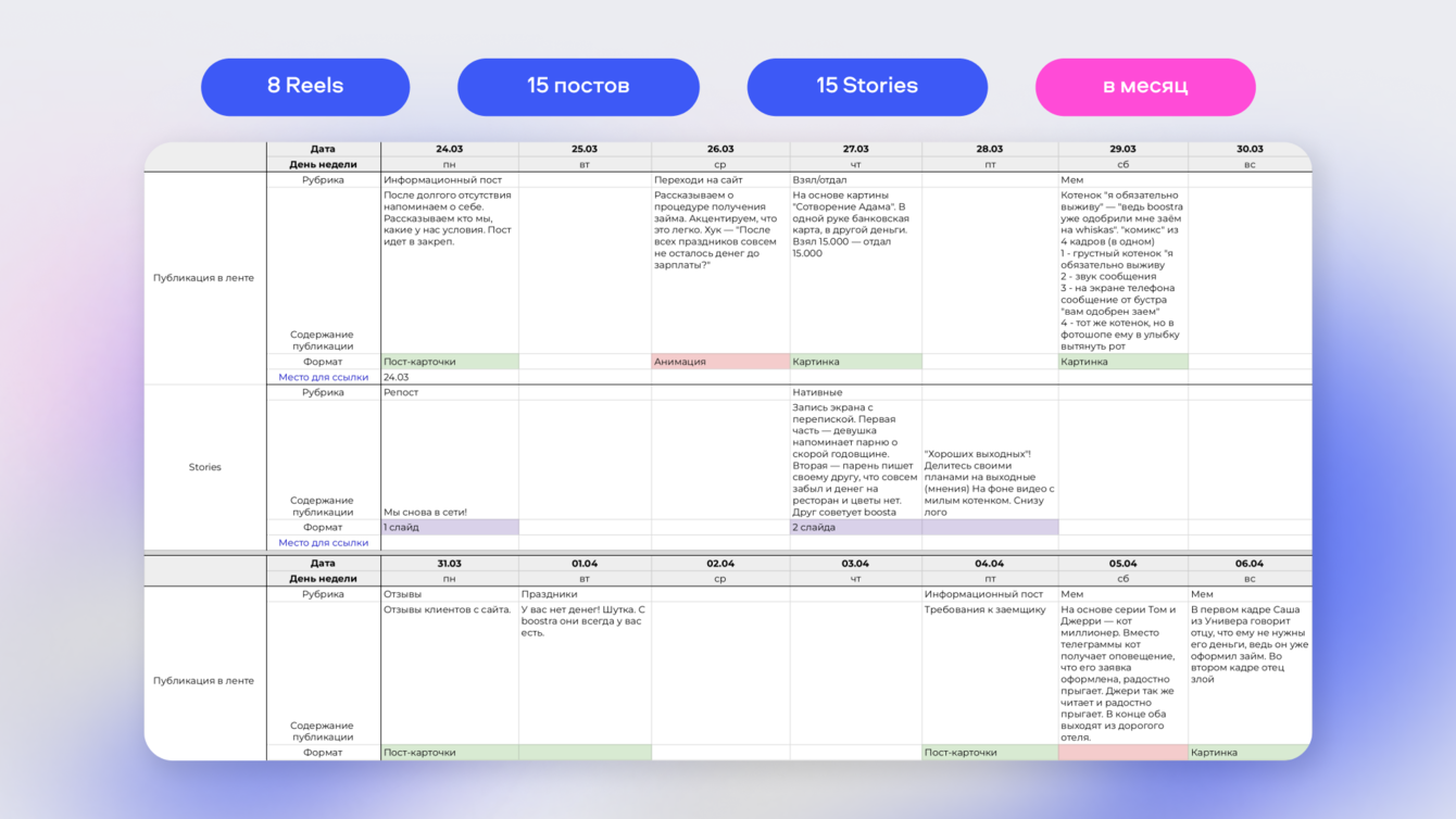 Продуктовые посты. Большая часть была о том, как работает сервис, как оформить заявку и как происходит оформление. Такие посты вызывают доверие у аудитории и снижают скептицизм, конкретно к платформе.