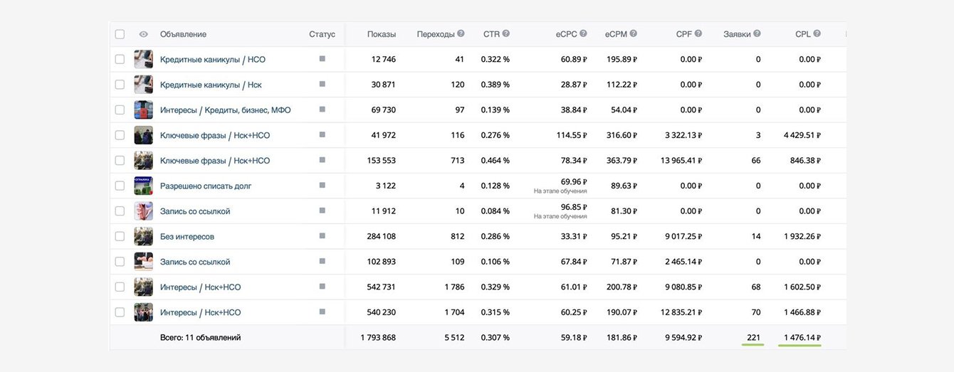 Лучше всего себя показали объявления, которые вели клиентов на лид-форму Vk. Мы постепенно отключали объявления, которые показывали худшие результаты, тем самым перераспределяли бюджет в пользу хорошо сработавших связок.