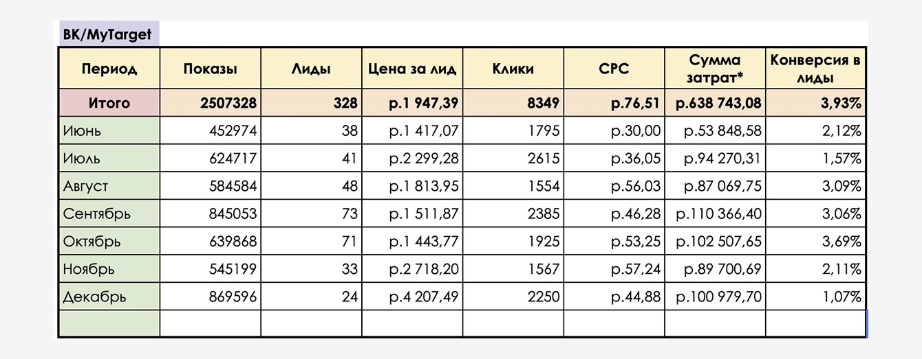 По итогам тестового периода оптимизировали рекламу, отключили трафик из MyTarget, так как он давал много переходов, но не приносил целевых лидов