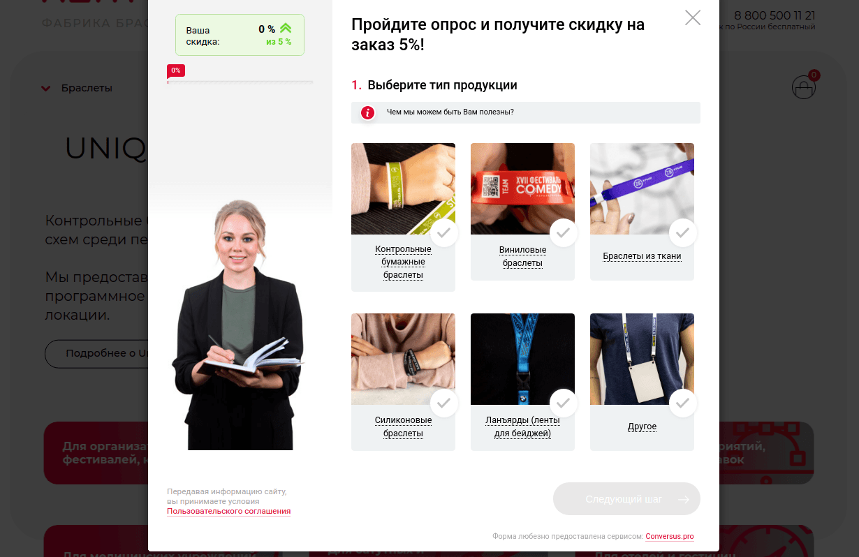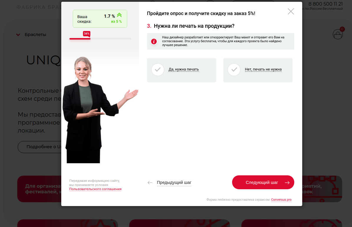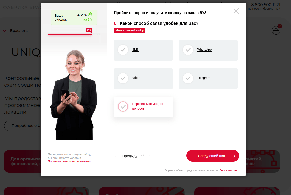 Разработка и подключение виджета квиз-опроса заняли пару часов. Чтобы заинтересовать пользователями прохождением опроса, мы предложили клиенту согласовать скидку в 5% в качестве мотиватора.