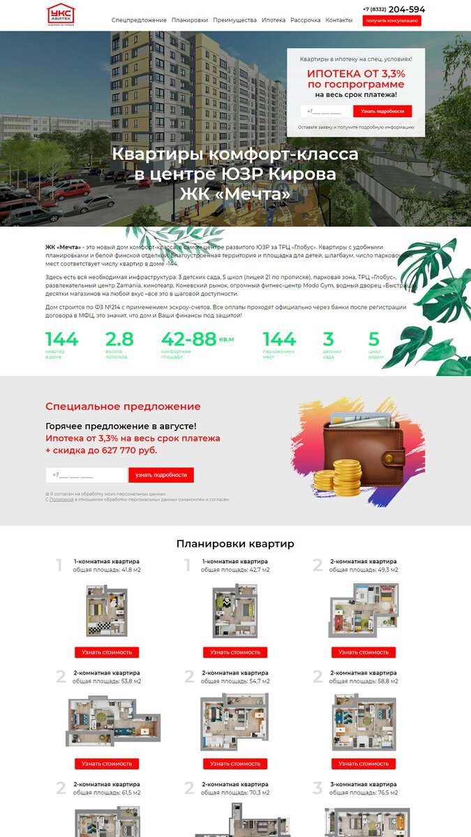 Большой опыт в работе с застройщиками в разных регионах позволил нам без труда создать посадочную страницу для ЖК "Мечта". Основной акцент делали на сбор лидов, поэтому снабдили лендинг формами обратной связи.