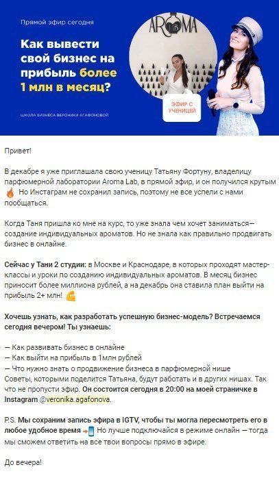 Под каждое мероприятие — прямой эфир, вебинар, новый инфопродукт — мы создаем отдельную цепочку писем, в которой последовательно ведем клиента от первого знакомства с предложением до покупки. Мы мягко, но эффективно прорабатываем боли аудитории и показываем ценность продукта.