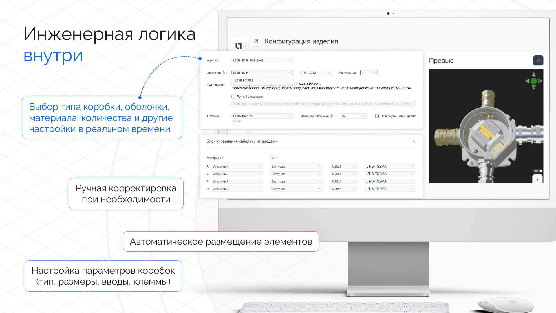 Центральным элементом решения стал браузерный 3D-конфигуратор распределительных коробок. Он предназначен для инженеров и менеджеров, которые подбирают изделия под конкретный проект заказчика и должны сразу видеть результат своей настройки.