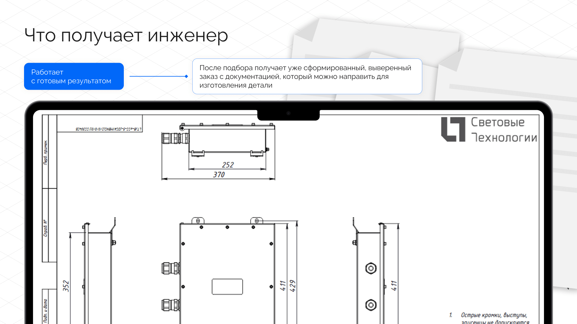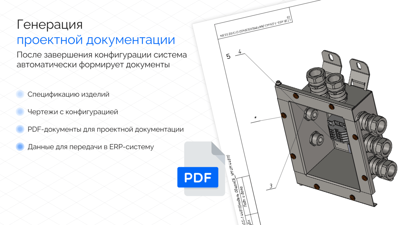 Ключевой результат работы — формирование спецификации и проектной документации. Платформа передает параметры изделия в систему проектирования, где на их основе формируются документы. Пользователь получает готовые файлы, которые можно скачать, отправить на производство или использовать для дальнейшей работы над проектом.
