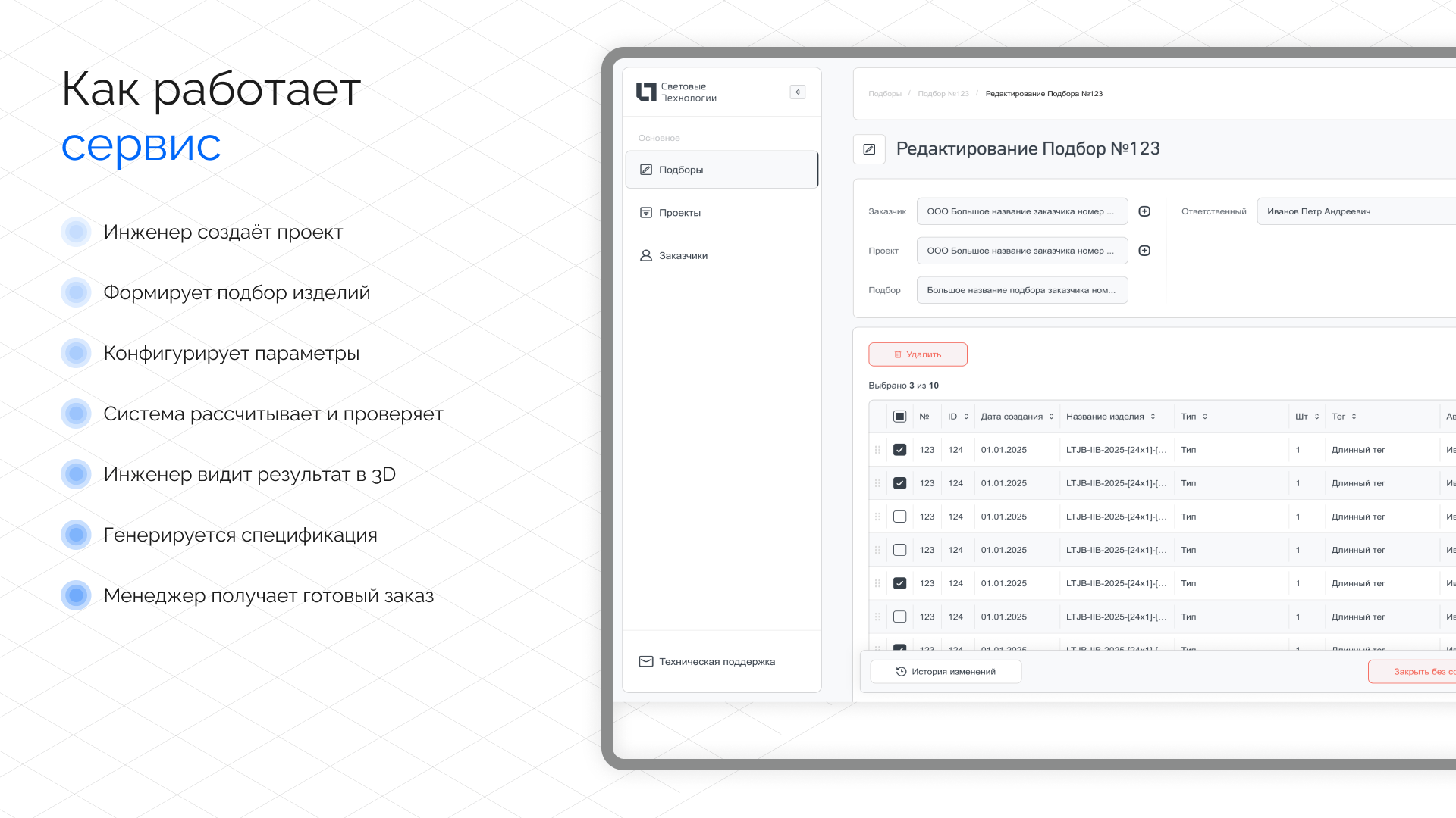Пользователь работает так: «заказчик → проект → подбор → изделие». Он может создавать подборы, дублировать их для похожих задач, добавлять теги и заметки, отслеживать статус подготовки документации и получать уведомления о готовности спецификаций. Это превращает конфигуратор в готовую рабочую среду для проектной деятельности.