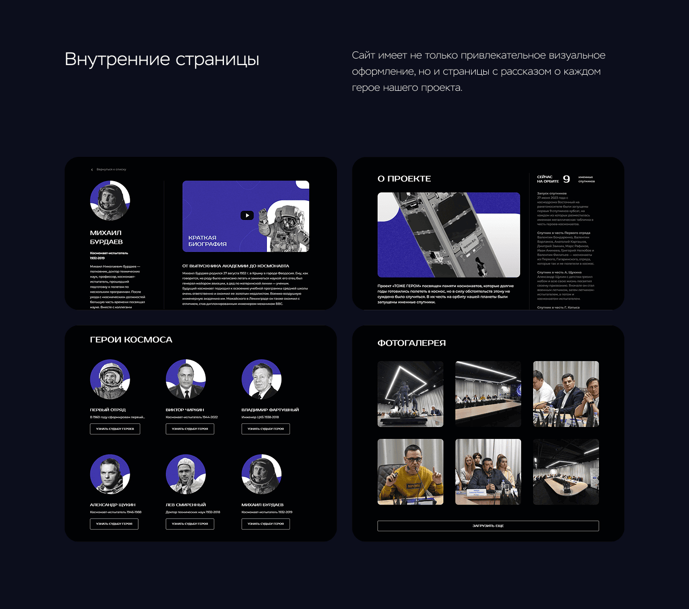 Для каждого космонавта разработана отдельная страница с подробной историей, архивными материалами и визуальным контентом. Дополнительно на сайте реализован раздел с новостями проекта, а также фото- и видеоматериалами, раскрывающими его развитие и общественный отклик.