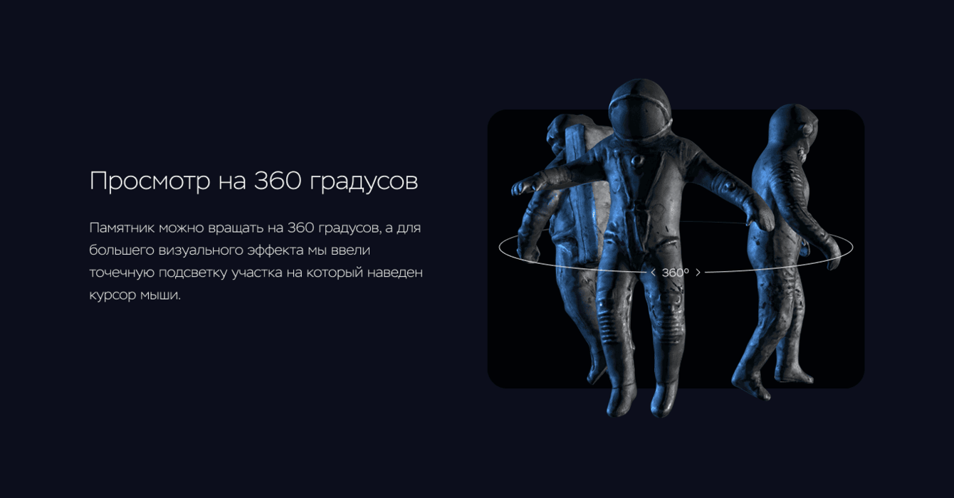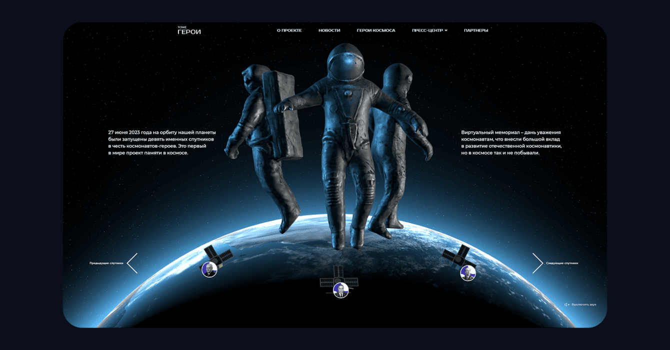 Вокруг скульптуры мы создали полноценное трёхмерное окружение: вращающуюся Землю, пролетающие астероиды и именные спутники, запущенные в честь героев. Спутники появляются в пространстве сцены и становятся интерактивными точками навигации — по нажатию пользователь переходит на страницу выбранного героя.