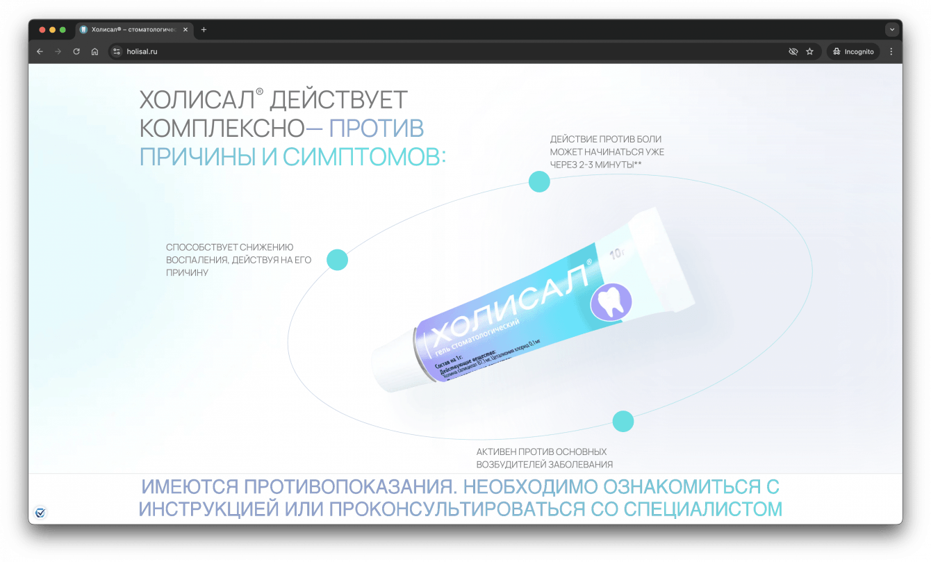 В сотрудничестве с агентством Catzwolf, которое предоставило дизайн, мы разработали сайт для препарата Holisal. Основным элементом проекта стало создание понятной карты пути клиента (CJM), которая помогла пользователям легко ориентироваться на сайте и находить необходимую информацию. Для лучшей презентации продукта мы использовали 3D-технологии в вебе, чтобы наглядно показать, как препарат подходит как для взрослых, так и для детей.