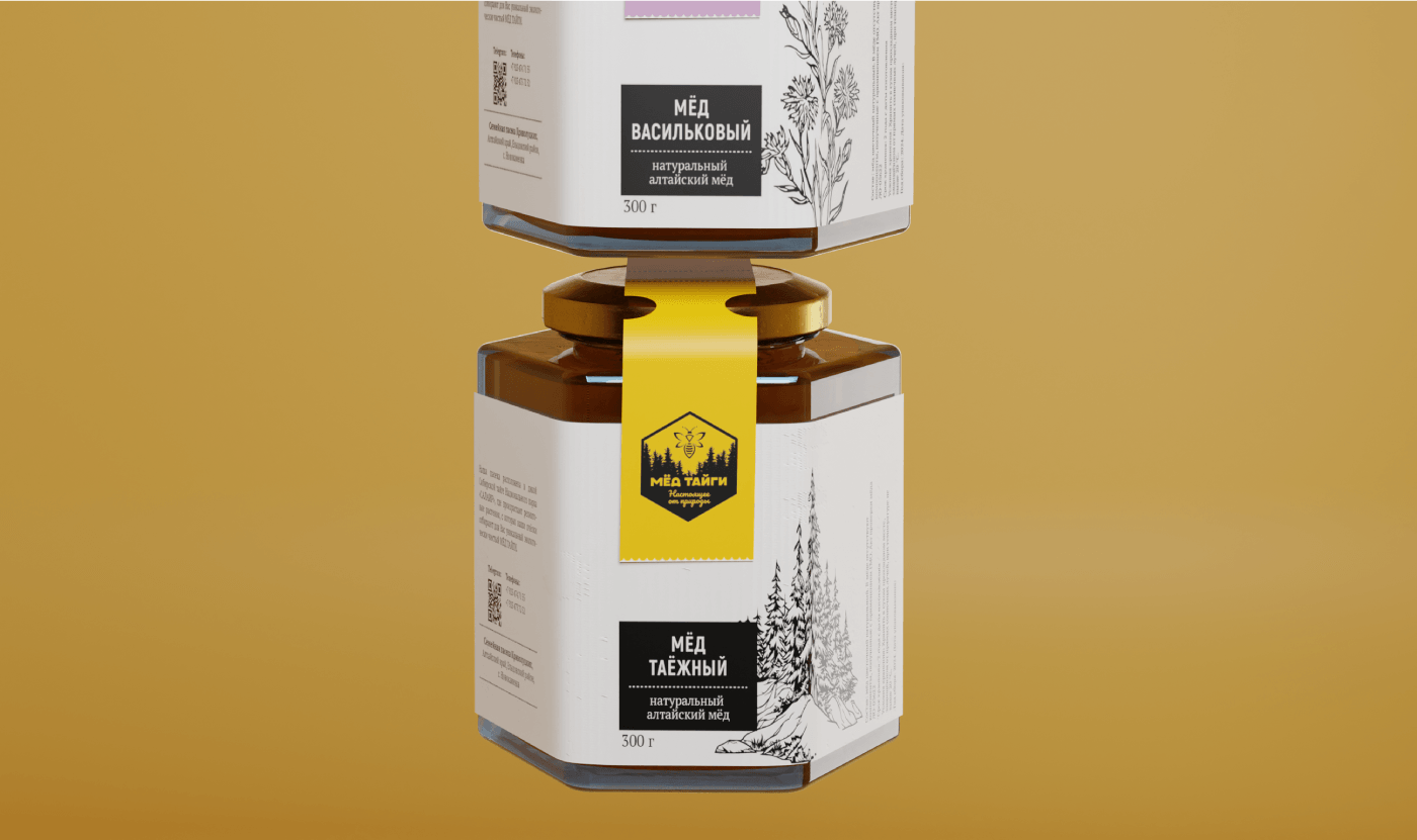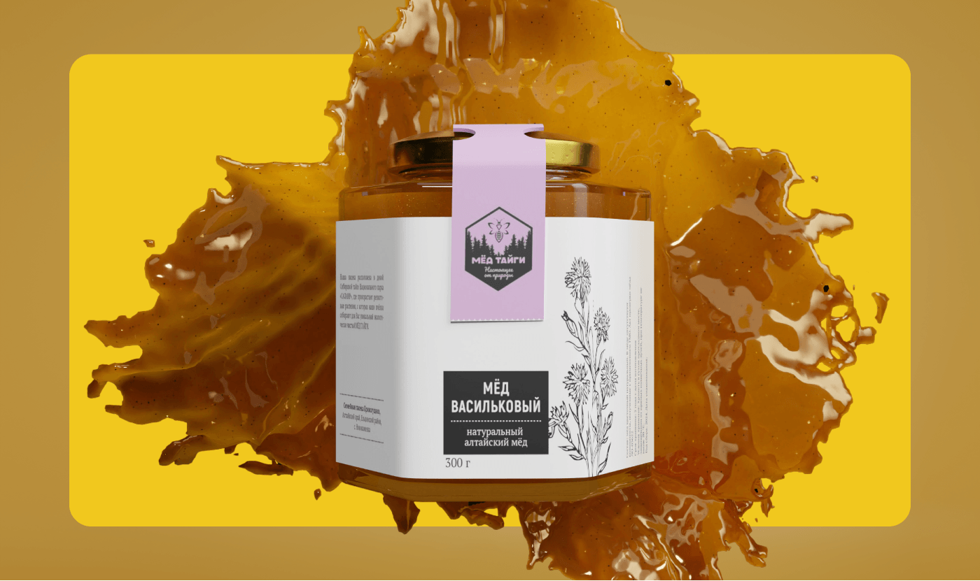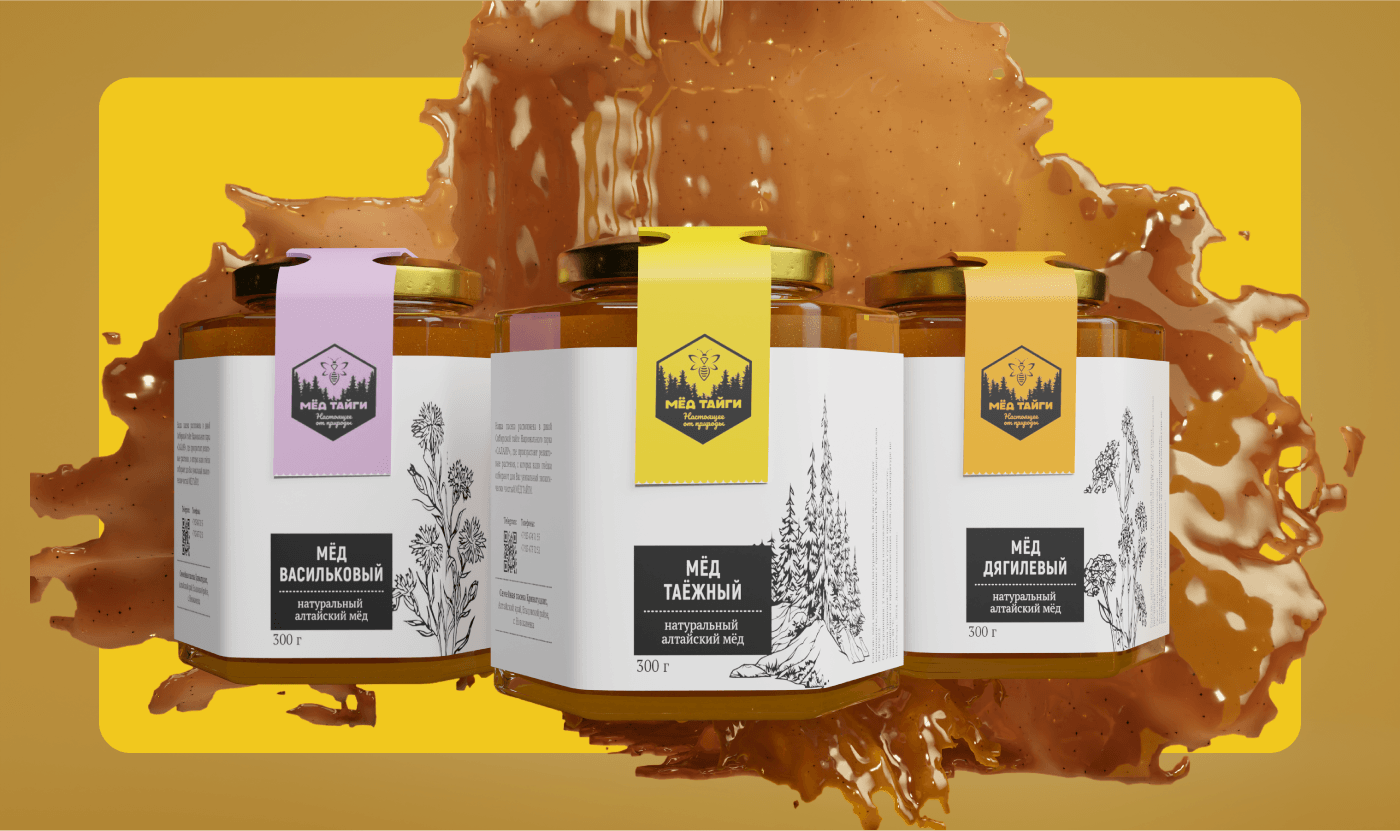 Создать упаковку и 3D-визуализацию для бренда «Мёд тайги», которая подчеркнёт натуральность продукта, передаст атмосферу Алтая и при этом будет выделяться на полке среди конкурентов.