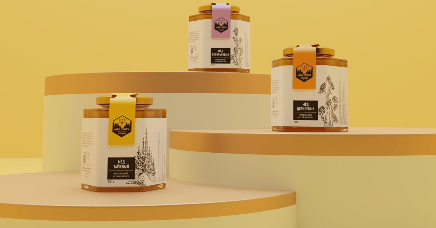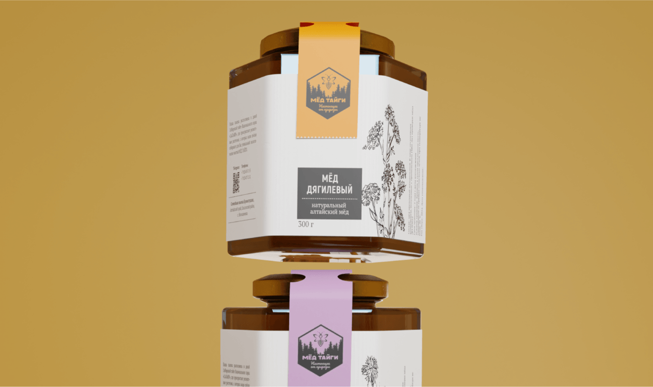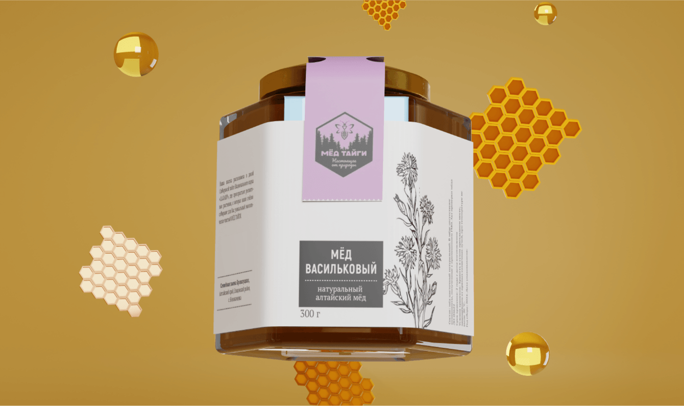 Создать упаковку и 3D-визуализацию для бренда «Мёд тайги», которая подчеркнёт натуральность продукта, передаст атмосферу Алтая и при этом будет выделяться на полке среди конкурентов.