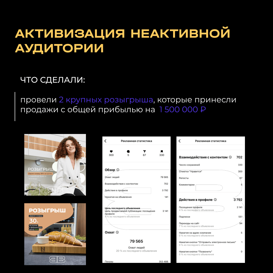 провели 3 крупных розыгрышы, которые принесли продажи на 1 500 000(с таргетированной рекламой)