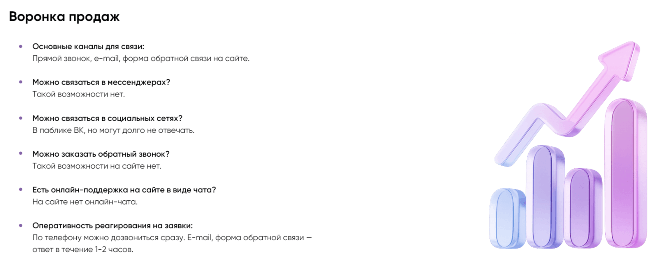 Также в ходе «тайной покупки» и общения с «продажниками» конкурентов мы заполняли анкету чек-лист: оперативность ответов, стиль коммуникации, особенности воронки продаж, работа с возражениями, ценовая политика и критерии.