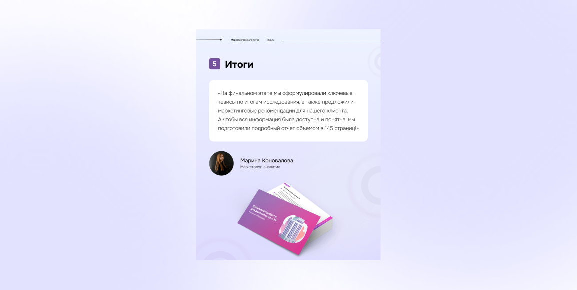 На финальном этапе мы сформулировали ключевые тезисы по итогам исследования, а также предложили маркетинговые рекомендаций для нашего клиента. А чтобы вся информация была доступна и понятна, мы подготовили подробный отчет объемом в 145 страниц!