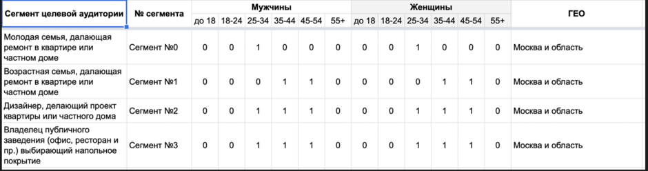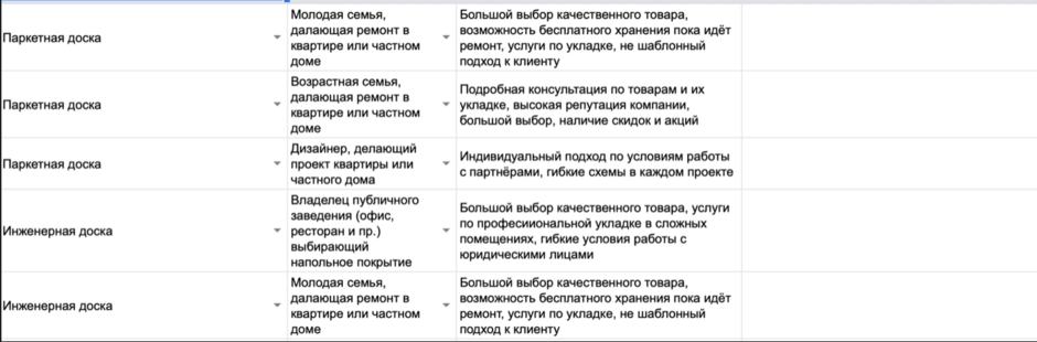 Чем лучше вы знаете свою целевую аудиторию, тем больше получаете заявок, продаж и прибыли. Мы донесли эту мысль клиенту: в ассортименте салона есть товар для разных частей аудитории. Одному нужен дорогой паркет в частный дом, второму массивная доска, а третьему простые напольные покрытия в офисное пространство. Нужно заранее поделить аудиторию на части и предлагать сегментам те ценности, которые им больше всего нужны.