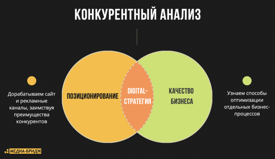 Уже на втором этапе разработки стратегии Заказчик мог запустить контекстную рекламу и получать максимальное количество заявок. Но где гарантии, что эти заявки будут конвертироваться в продажи, а часть покупателей станет постоянными? Всегда есть вероятность, что найдется конкурент, который предложит аудитории лучшие условия и переманит клиентов на свою сторону. Для этого и нужен конкурентный анализ: найти варианты улучшить качество бизнеса и закрепить позиции в нише.