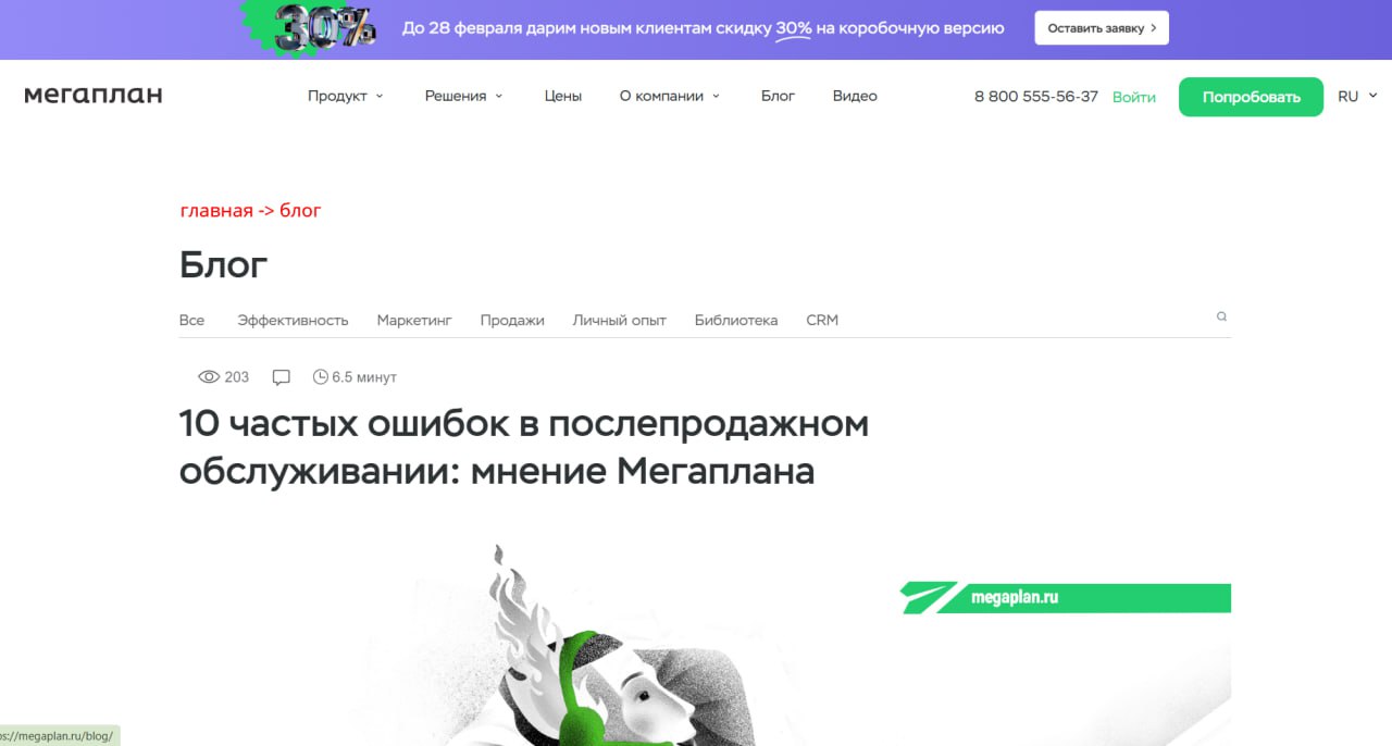 До начала работ на сайте «Мегаплана» уже был блог, но большая часть материалов не соответствовала реальным потребностям целевой аудитории. Статьи затрагивали темы, которые скорее относились к общему саморазвитию и лидерству, а не к CRM-системам и автоматизации бизнеса.