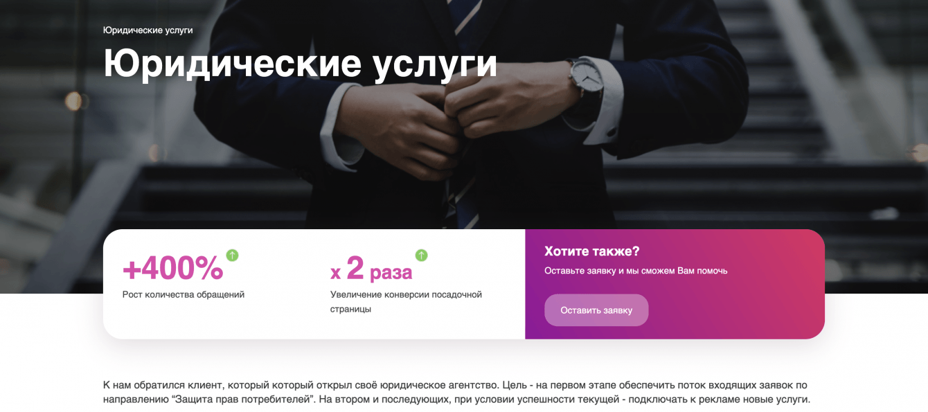 К нам обратился клиент, который который открыл своё юридическое агентство. Цель - на первом этапе обеспечить поток входящих заявок по направлению “Защита прав потребителей”. На втором и последующих, при условии успешности текущей - подключать к рекламе новые услуги.