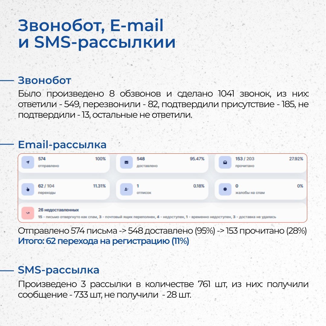 5. Звонобот совершил 1000+ звонков, с помощью Email-рассылки было отправлено 570+ писем, с помощью SMS-рассылки 760 сообщений. После мероприятия было собрано 35 отзывов от участников мероприятия.