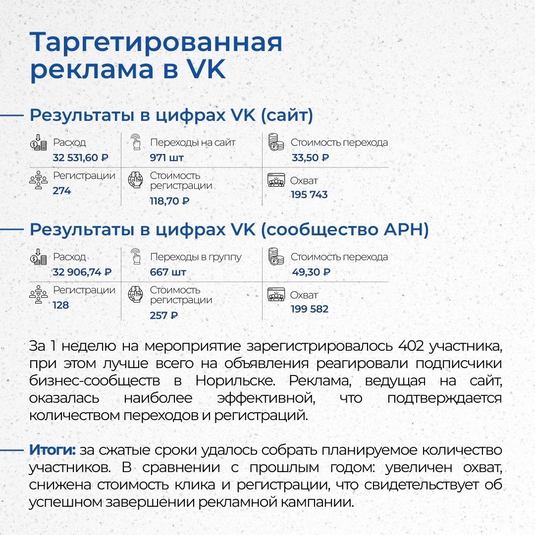 4. Таргетированная реклама. В сравнении с предыдущим годом показатели были значительно улучшены: увеличен охват, снижена стоимость клика и регистрации. За неделю на мероприятие зарегистрировалось более 400 участников. В период проведения рекламных кампаний, без призыва на подписку, в сообщество АРН вступили 28 человек.