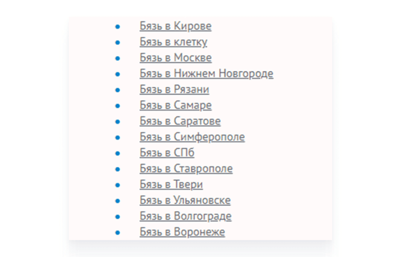 Также для продвижения по другим регионам мы создали порядка 90 дополнительных страниц, которые оптимизировали под геозапросы. Для усиления веса таких страниц создали отдельную страницу, где вывели ссылки: