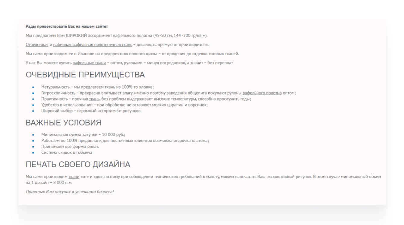 Для основных разделов и дополнительных страниц написали SEO-оптимизированные тексты, сверстали по рекомендациям поисковых систем: с выделением подзаголовков, списков.