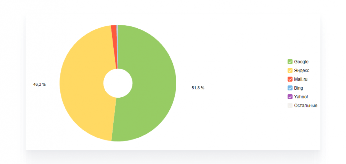 При этом довольно ровная посещаемость из обеих поисковых систем Yandex (46,2 %) и Google (51,8 %), что говорит о хорошем уровне проработки. Особенно важно в текущих условиях, когда реклама в Google не доступна российским сайтам.
