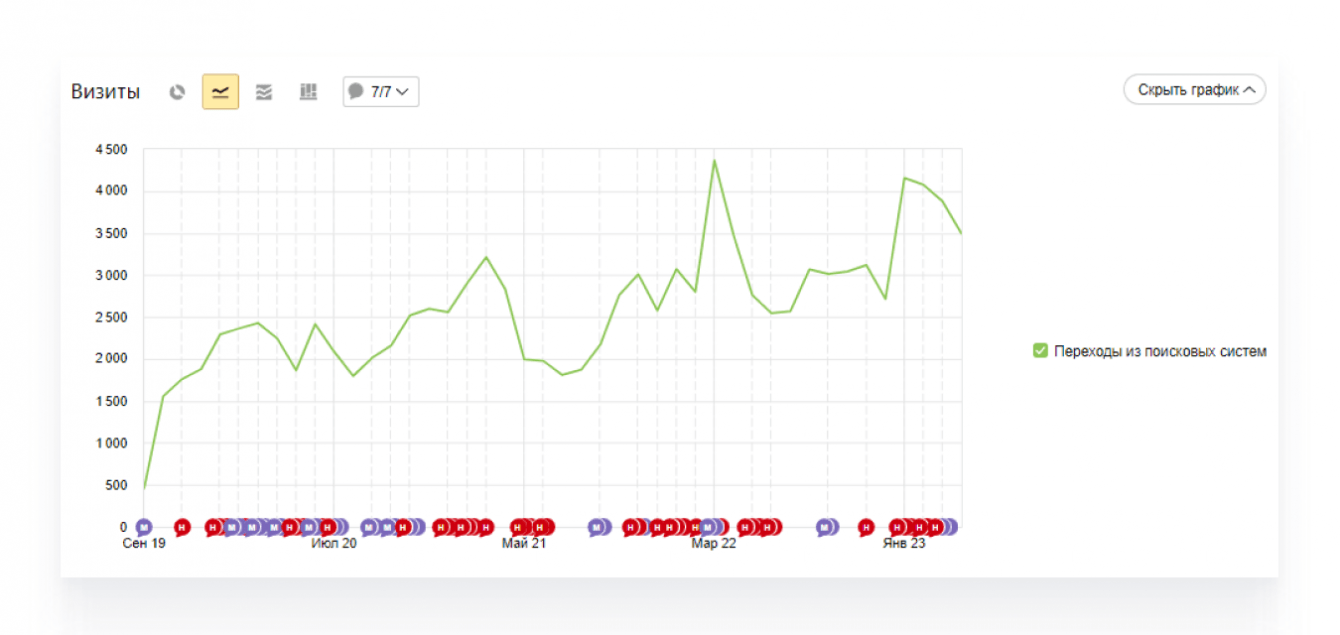 1. Нам удалось увеличить число переходов из поисковых систем в 2,9 раз! С 1500 на старом сайте до 4367 в самые хорошие месяцы: