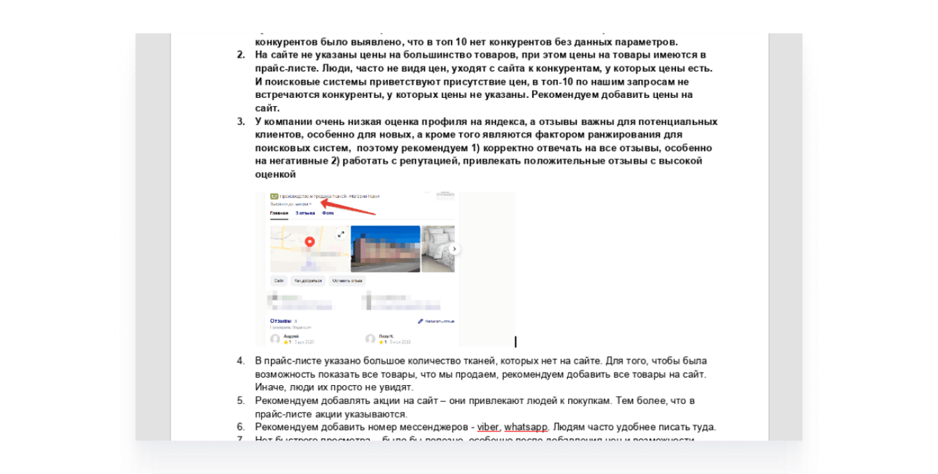 Анализируем рынок, конкурентов, весь сайт и приводим рекомендации, которые полезные и часто необходимы как для успешного поискового продвижения, так и для роста продаж при текущем трафике: