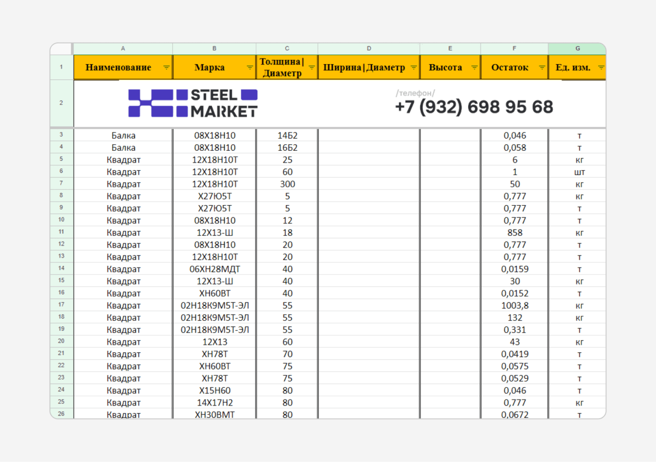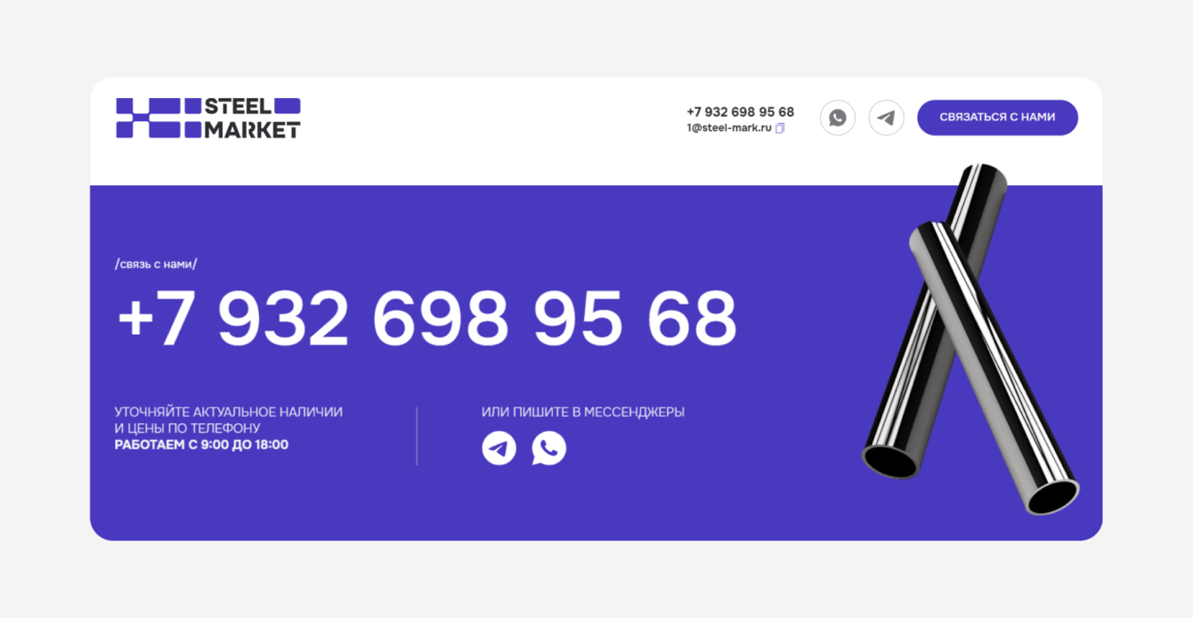 Мы осознанно сделали доступный по клику прайс-лист, так как наша аудитория не заполняет лид-формы. Сразу же под главной страницей мы разместили кнопку с актуальными остатками, которые автоматически обновляются. При нажатии на кнопку открывается гугл-таблица со складскими остатками и номером телефона. Этот шаг показал максимальную эффективность: после добавления кнопки трафик сразу начал приносить клиентов. Прежде чем звонить или писать на почту, пользователи могут проверить наличие и количество интересующего их спецсплава, а затем уже оформить доставку, что очень удобно.