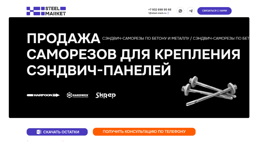 После успешного внедрения лендинга для спецсплавов, мы создали ещё один лендинг для саморезов по той же схеме.