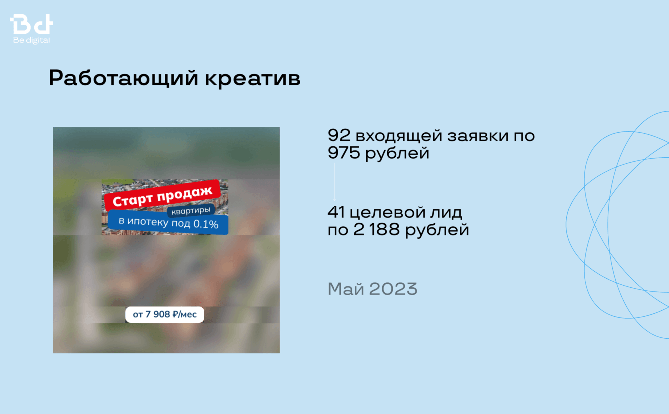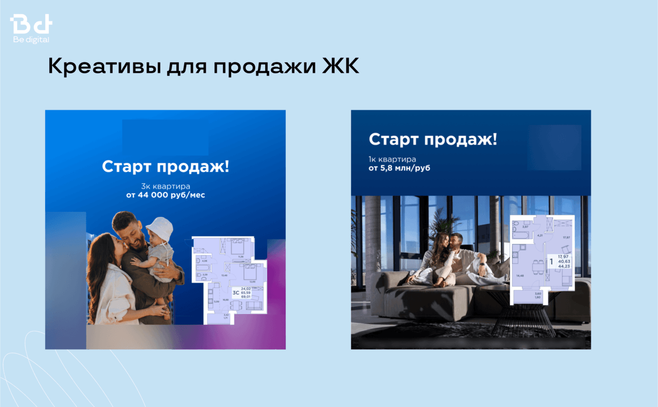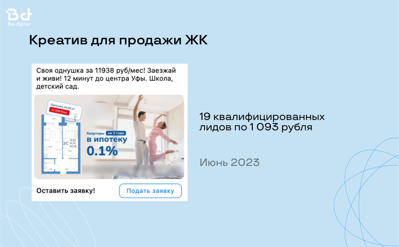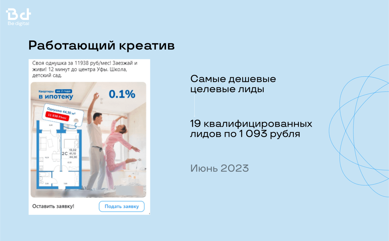 У нас в Be digital большой опыт работы с застройщиками, поэтому есть готовый набор гипотез и эффективных креативов, чтобы заказчик начал получать целевые лиды со старта.