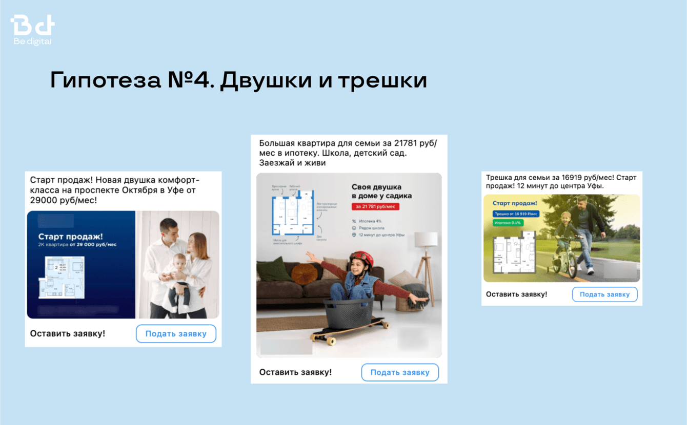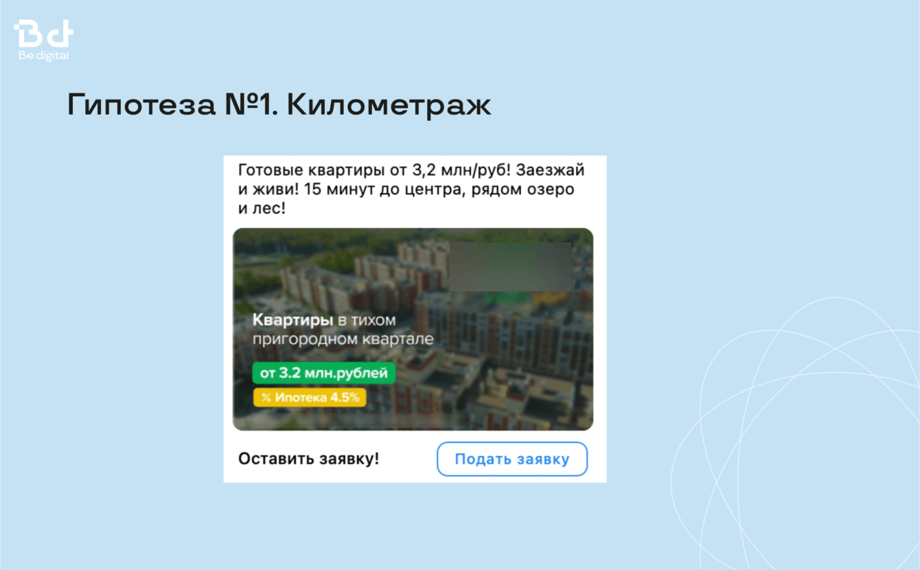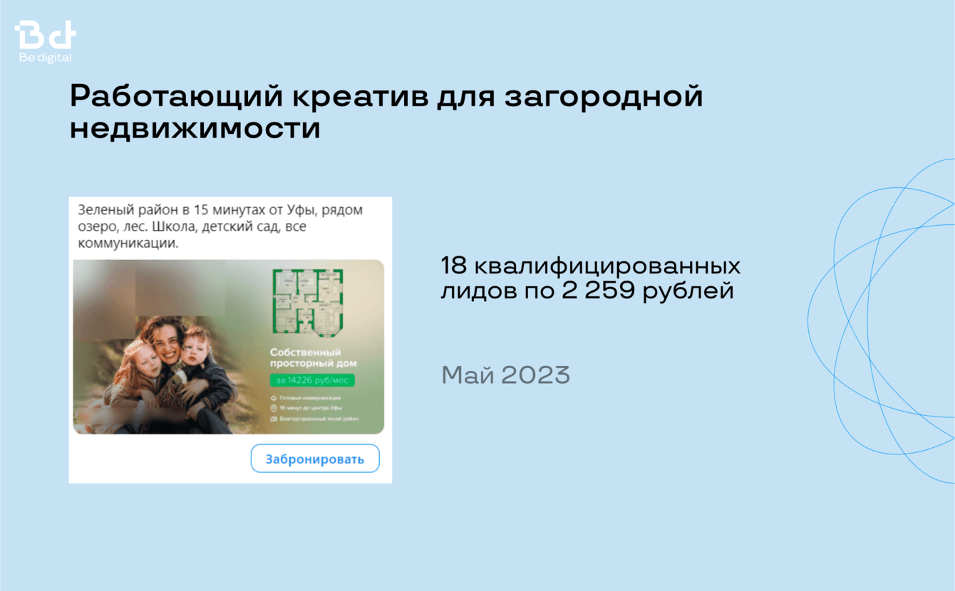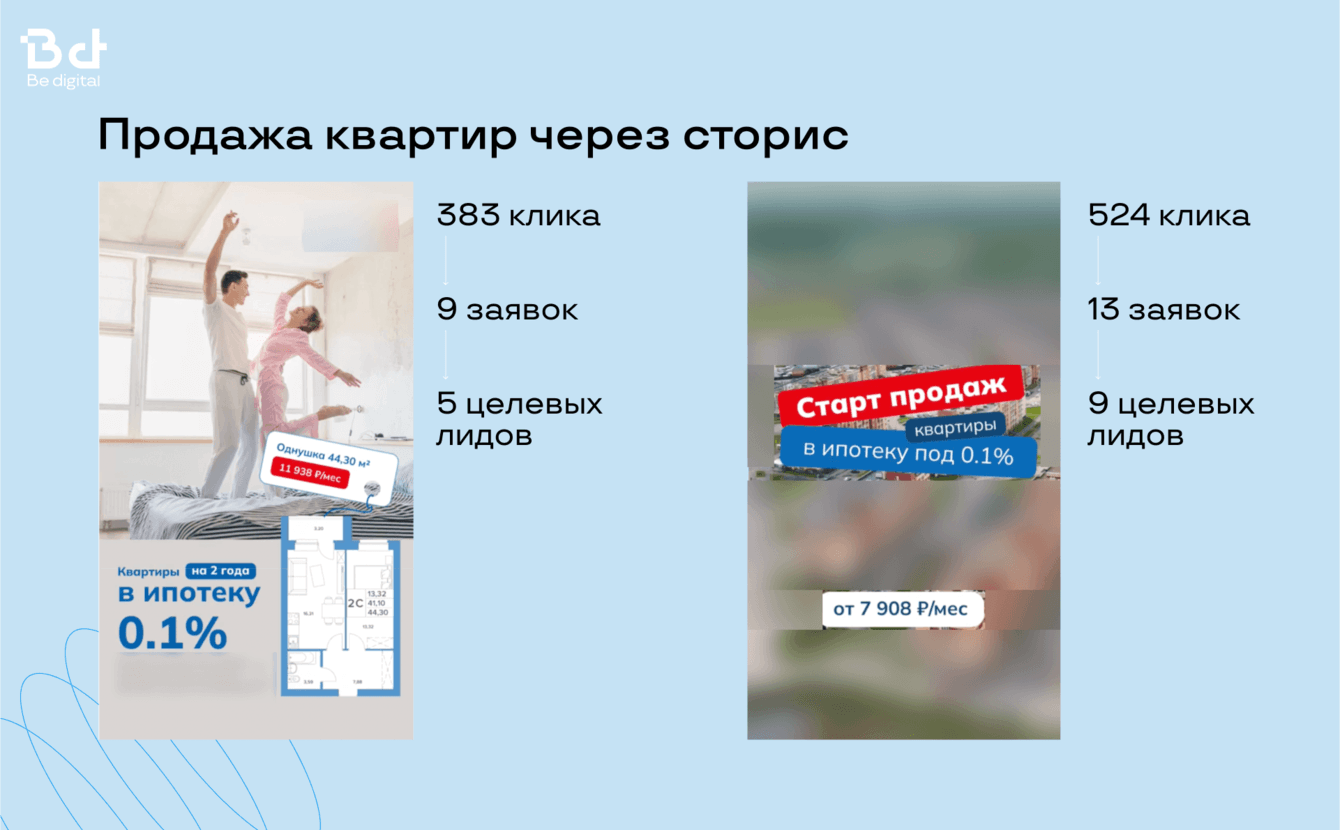 У нас в Be digital большой опыт работы с застройщиками, поэтому есть готовый набор гипотез и эффективных креативов, чтобы заказчик начал получать целевые лиды со старта.