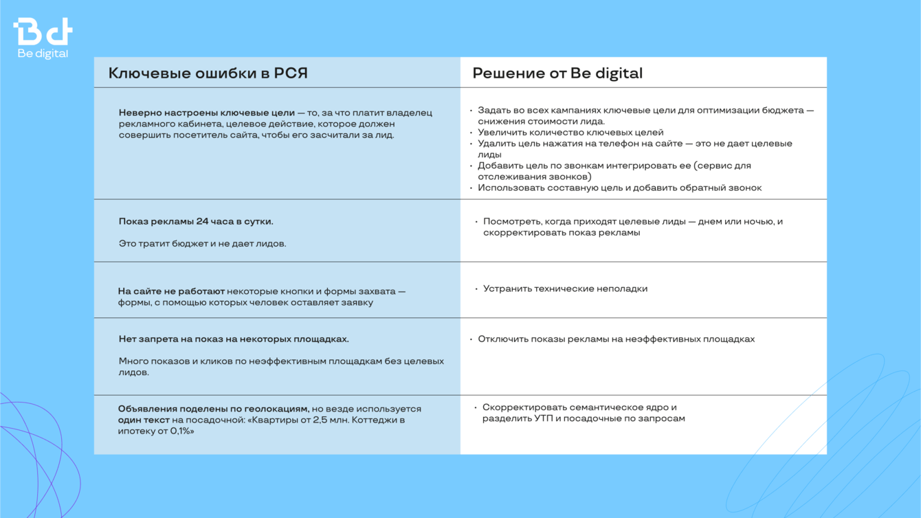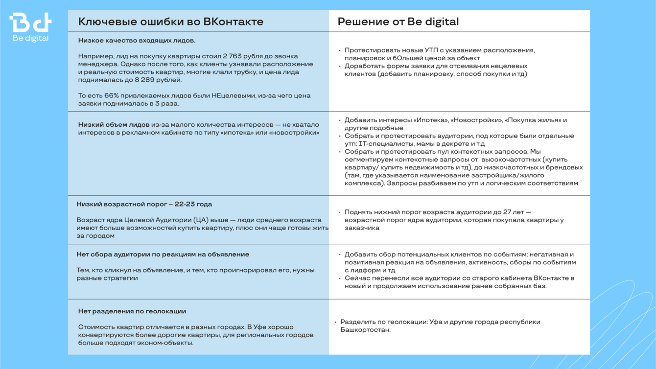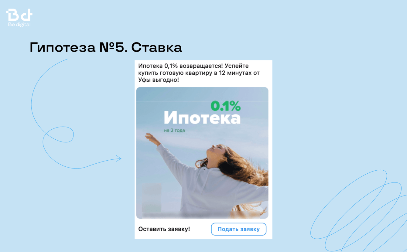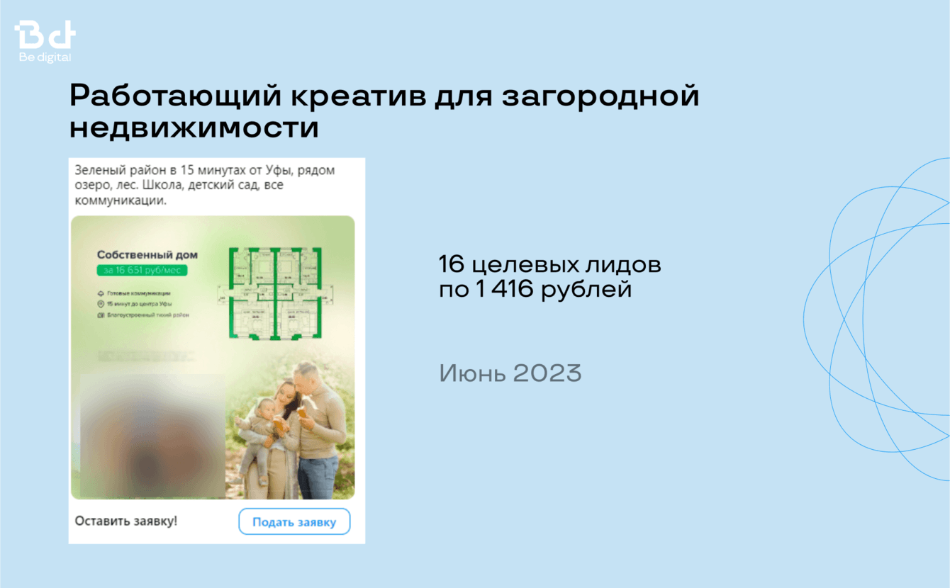 У нас в Be digital большой опыт работы с застройщиками, поэтому есть готовый набор гипотез и эффективных креативов, чтобы заказчик начал получать целевые лиды со старта.